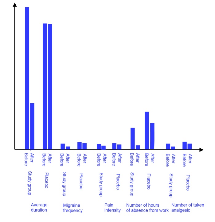 Hóa ra là trong nhóm nghiên cứu đã giảm đáng kể số ngày bị đau nửa đầu, thời gian của cơn, số ngày nghỉ làm và số lượng thuốc giảm đau đã uống. Trong khi không có sự thay đổi về cường độ đau trong cơn đau nửa đầu.